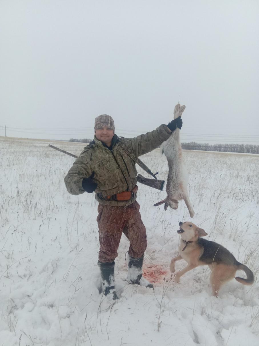 Приехав на место, настроение совсем упало - следов нет. Решаем заглянуть в овражек, где в прошлом сезоне матёрый косой два раза меня обдурил. Но в овраге косой не решился залечь. Пока я ходил прочесывать ещё одну лощинку, Денис набрёл на утренний след и сразу скидка. Идём тропить: настроение заметно поднялось. А вот и вздвойка, скидка, ещё одна и ещё. А вот и заяц- лежит в ковыле, соорудив там себе лежку, смотрит на нас, а мы на его. И тут нервы у него не выдерживают. Прозвучали выстрелы и заяц пал, не пробежав и 15ти шагов. Идём к машине и по догоге замечаю еле заметную скидку. Начинаем распутывать. Но натыкаемся на гонный след. Ага: имеем дело с профессором. Решаем его погонять. Я с молодым выжлецом по следу, а товарища отправляю на номер. Часа два его гоняли и скидок он понаделал и водил меня туда-сюда. Удавалось ему меня обхитрить и показывался и терялся из поле зрения. Но и мне удалось развернуть его на номер. Немного он до стрелка не дошел. Скинулся в посадку на другую сторону. Хотел меня пропустить. Но что-то меня сподвигло перейти посадку. Только першел- подъем, выстрелы через посадку, заяц выскочил на дорогу и побежал в обратную сторону. Косой пробежал метров 300 и скинулся в посадку. И на следу была крупинка крови. Всё, надо добирать. Много писать не буду: в итоге удалось его обратно толкнуть на номер. Денис уверенно сделал свое дело. Подранок добран. Ещё один профессор пал. 2:0 норма.