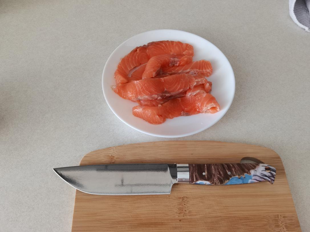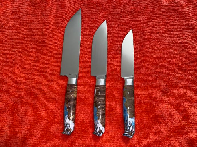 Сама о себе не позаботишься...Готовлю часто и с удовольствием,поэтому нож на кухне очень важный предмет. Мастера с Новгородской области изготовили мне кухонный набор. Эскизы с размерами рисовал сам,остальное обсуждали. На клинках мартенситная легированная сталь N690, называемая также австрийской кобальтовой нержавейкой, производится корпорацией Бёхлер и полностью удовлетворяет международным стандартам качества стальной продукции.