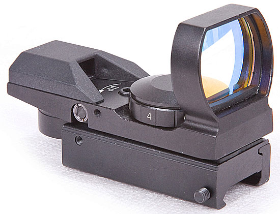 Коллиматор как на фото, 4 целеуказателя + 3 режима яркости красные целеуказатели и 3 режима яркости зеленые целеуказатели, зеленый на малой яркости удобно в сумерках.