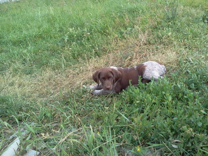 Щенок растёт.Думаю что в августе его уже можно будет натаскивать.Отец щенка рано начал в поле работать,мать тоже.Хозяина хорошего бы ему!!!