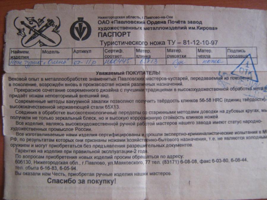 А вообще, мне говорили, что любой охотничий нож должен иметь что то типа паспорта, чтоб не было проблем. Отцу давали при покупке бумажку. в которой написано нож охотничий "Кабан".