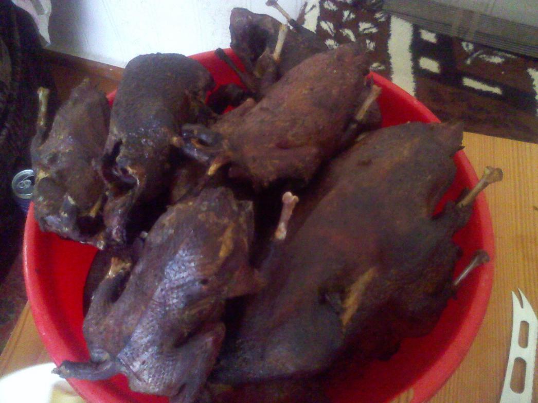 Обработанная утка, предварительно (1-2ч.) вымачивается в растворе уксусной кислоты, с лавровым листом и приправой( молотый перец).
