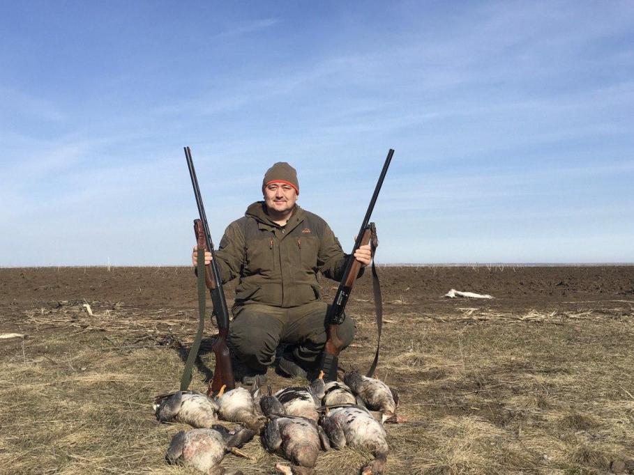 местные и мало того что окружили да еще в центре шалаш поставили . Решено было искать дальше, на мотав еще пару сотен километров нашли интересную присаду "гуси-лебеди" В ночь как положено окапались, благо оренбургская земля с песком. Очень опасались что будут конкуренты, но как ни странно никого в округе не было, выстрелы слышны были только далеко, итого за два дня норму взяли, на двоих восемь белолобых Гусь идет весне дорогу!!! |