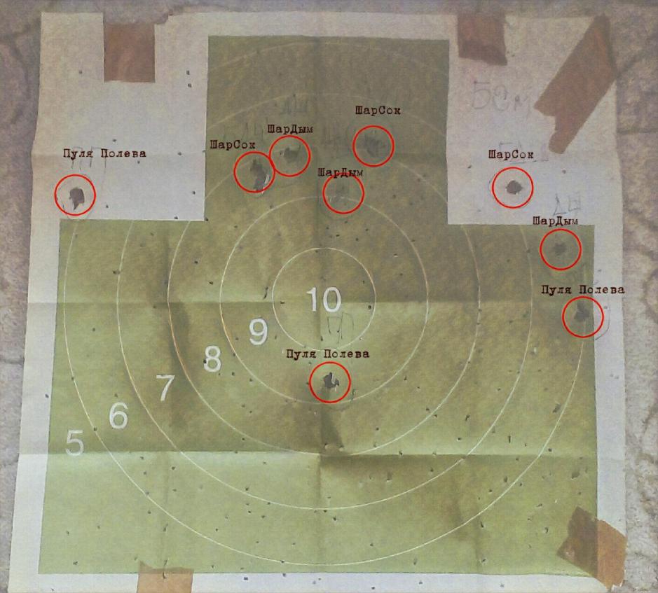 Было: 20 патронов. 10: пуля-шар Lee на дымаре - 3 попадания, 5: пуля-шар на Соколе - 3 попадания, 5: пуля Полева на Соколе - 3 попадания. Расстояние 50м, с рук. Ветер: слева-направо.