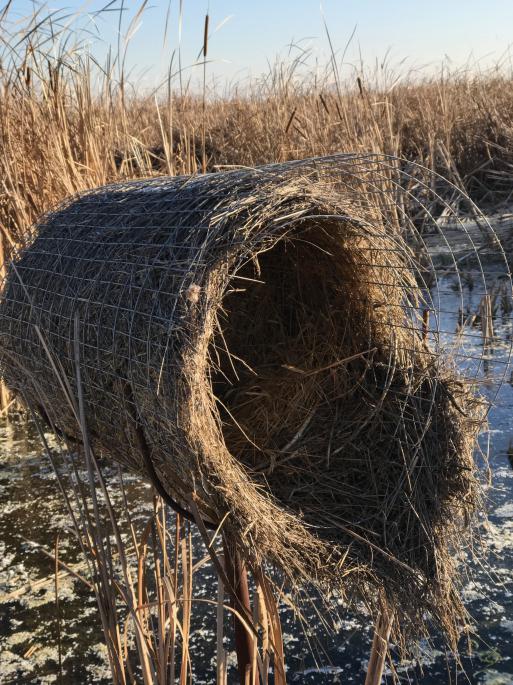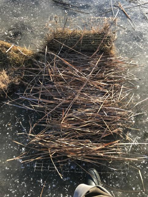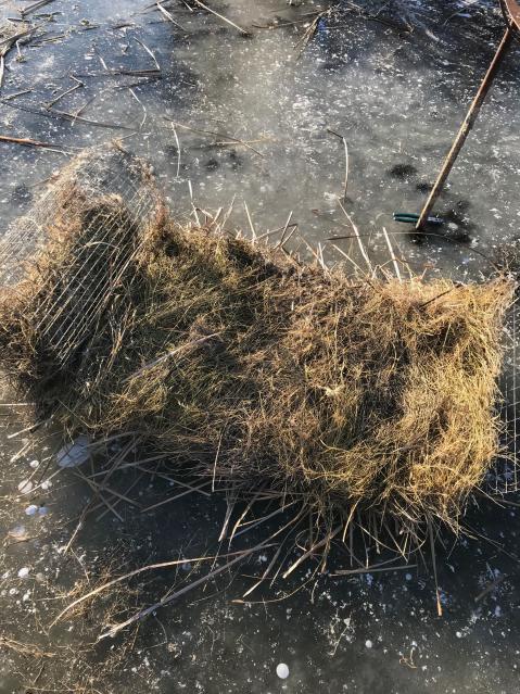 Всем Доброго дня! На выходных добрался до гнезд! Первое и самое главное их не украли !!! Заселение в гнезда к сожалению не произошло, но это было ожидаемо. За 7 месяцев их немного потрепало см. на 1 фото. Все таки я пришел к тому что сетку луче купить дороже 25х25мм., сэкономите время на инспектирование гнезда. Снял гнезда, развернул, убрал оставшееся сено, набил сухим камышом, поверх постелил старое сено, завернул, установил гнезда на место. Посмотрим как набивка из камыша переживет зиму. В планах перед прилетом птицы по льду проинспектировать гнезда еще раз, собрать и установить еще 4 гнезда из сварной сетки 25х25. Ждать заселения)))