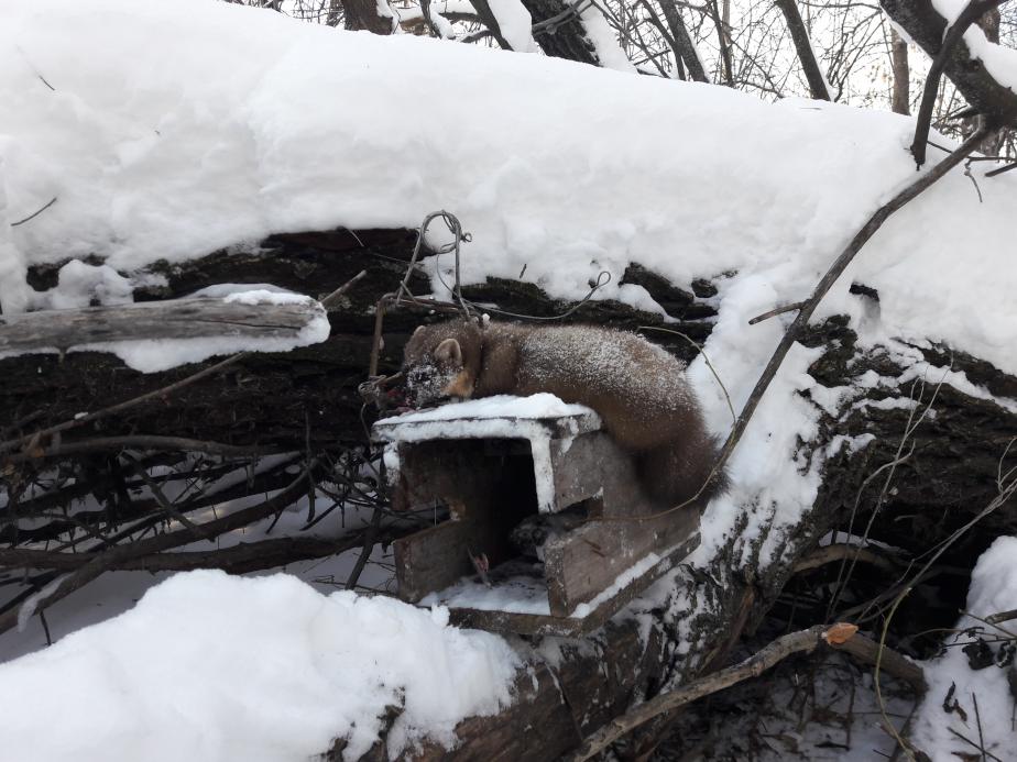 Всем доброго вечера . Какая сегодня отличная погода после метели -10 солнце и ни ветерка- идиллия! Пришёлся по своим ящикам ( привада- протушенные бобрячьи кишки (запах атас)))- но результат есть! - а значит, угадал с приманкой. Сегодня ещё пробираясь, через бурелом, поднял секача (а ружье то в машине, как назло оставил)- думаю, на дереве, хоть и не холодно особо, а дуба за пару часов дашь если загонит, но мы разошлись миром. Нашёл ещё один норочьий городок- так что заниматься есть чем. Всем удачи