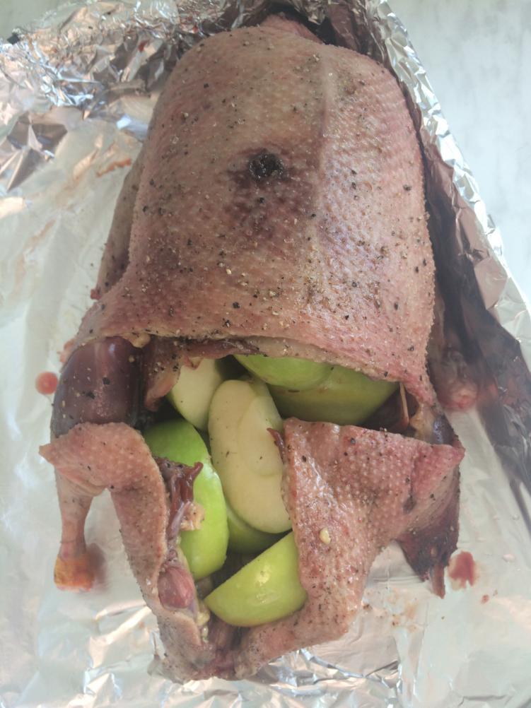 Гусь!!! Гуся я не смог добыть в этом году, но вот есть товарищи, которые сделали это за меня (Макс, спасибо!!!). Рецепт таков: гуся вымочил и натер солью и перцем, пара часов и потрошки нарезал... Далее гуся набил зелеными яблоками, зашил, придал праздничную раскраску и в духовку, при 170 градусах 1,5 часа, при 140 еще 1 час (соком из противеня поливал через 10 минут), и при 110 градусах с овощами еще 40 минут. Патрошка в отдельный горшочек с картошкой и капустой. Очень вкусно, особенно под сухое красное винцо... |