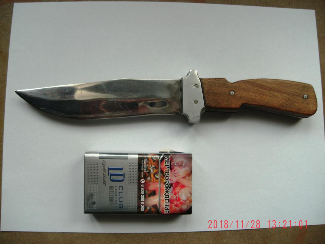 Вот мой верный друг со мной охотится с 1988г. Сталь неизвестна, ручка, по моему, бук, заточку держит отлично, место рождения - одна из зон Кировской обл. Ножны сшиты из старой портупеи в том же 1988-м.