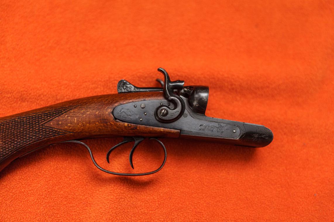 Душевное ружье. Цветную калку жалко зачернили. Дерево симпатишное, но от чего оно? Полупистолетка на современный лад. Для не посвященных вставлю 5 копеек. Правый ствол 0,5, левый 1,0. Сверловка 16,8. Вес в районе 3200. Типа Ап.