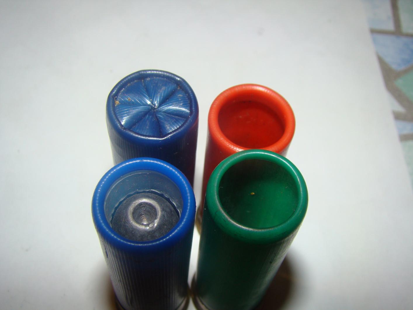 Фото 1: Синие - пулевая Вэлконт, зеленые GAep (красная RCC засыпана только дробью и поддавлена "колокольчиком" на станке Lee для придания конуса, фото конечно не информативное, но конус задает очень зачетный)
