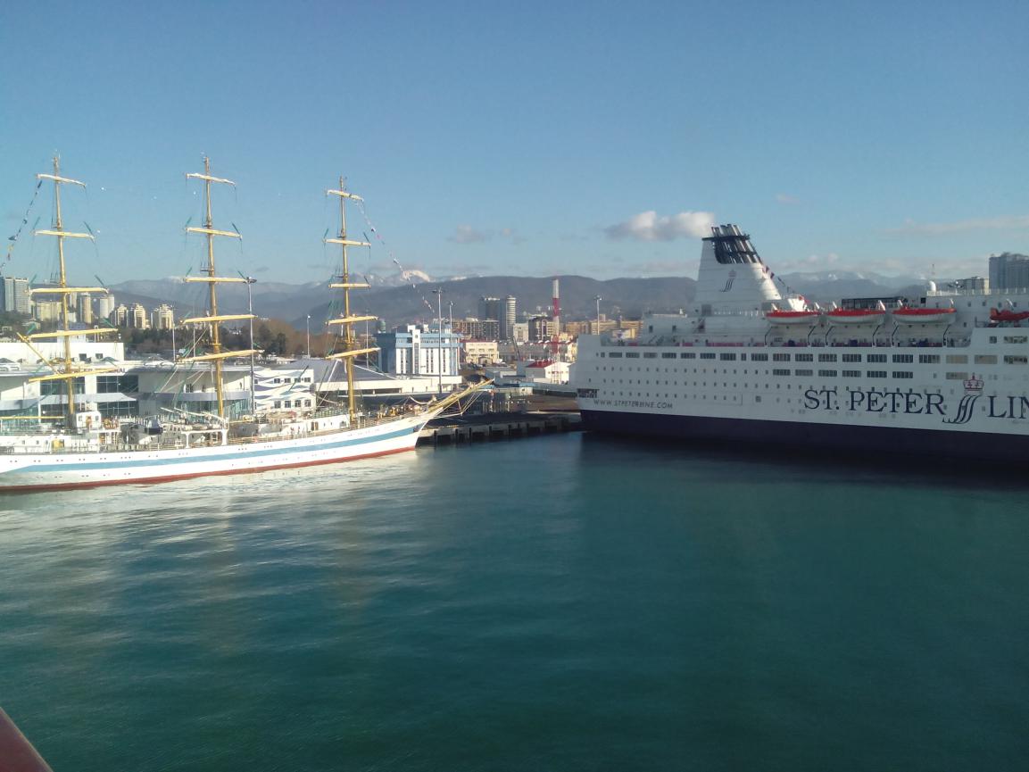 Это Сочи морской порт. Т.к. проходит олимпиада и проблемы с гостиницами пригнали шесть судов класса атлантика судно называется norvedjinal jet 16 палубный вместимось 6000чел. Двигатель мощность 53000л.с.
