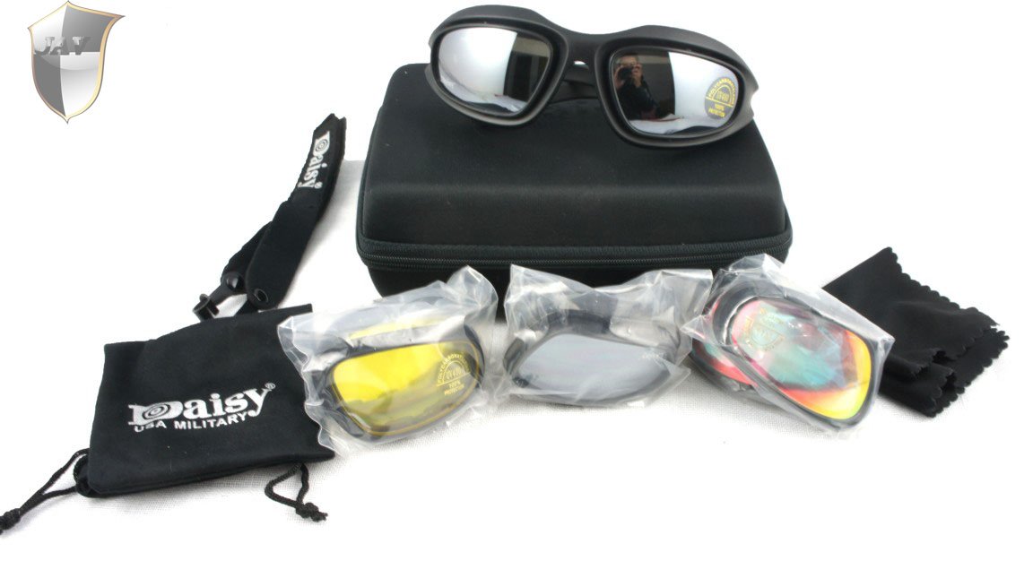 Новые баллистические защитные очки Daisy C5 с мягкой вставкой, благодаря которой очки полностью закрывают глаза от пыли и песка. Материал линз: небъющийся полиэфир углерод. Защита от ультрафиолета UV400. Вес 44 гр. Комплектация: удобная коробка для всего комплекта, чехол для очков, четыре комплекта сменных линз: (серые: обеспечивают правильное определение цвета. Идеально подходит для повседневного использования; медно-коричневые: увеличивают контрастность. Идеально подходит для использования при ярком солнечном свете для вождения автомобиля/велосипеда/игре в гольф; прозрачные MLC: прозрачные линзы со специальным многослойным покрытием. Усиливают остроту зрения при условиях низкой освещенности; желтые: высоко контрастные желтые линзы. Идеально подходит для очень низких условий освещения), замшевая тряпочка для уходом за линзами, резинка для крепления очков на голове.