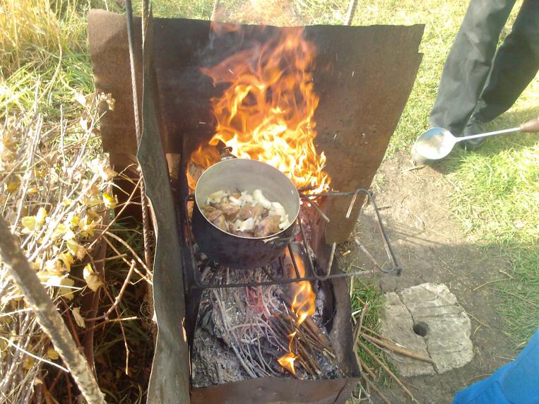 И так полдела добыть дрозда, вторая половина его приготовить. Как полагается ощипываем, потрошим ( сие спорное мнение, во многих странах например Греции, Италии, где массово охотяться на дрозда, а так-же в царской России времен Аксакова их не потрошат, готовят, как есть, только ощипывают, следует заметить, что эта птица там отнюдь не дешевка, дюжина дроздов на Кипре стоит 12 евро. ) Тем временем разводим огонь, (по моим наблюдениям, лучшие дрова, для такого блюда-ива, которая при горении выделяет очень много дыма) Берем посуду, лучше что-то типа казанка. Наливаем на дно растительного масла, на довольно большом огне, что-бы избежать выделения жидкости обжаривем тушки до румяной корочки. Следует заранее заготовить и начистить овощи для шулюма: Мы берем; лук, картошка, морковь, сладкий перец и помидор. Овощи могут быть на любителя или какие есть, просто оглашенный список, признан самым подходящим для этого блюда. Естественно все овощи порезать, средними кусочками или на любителя.