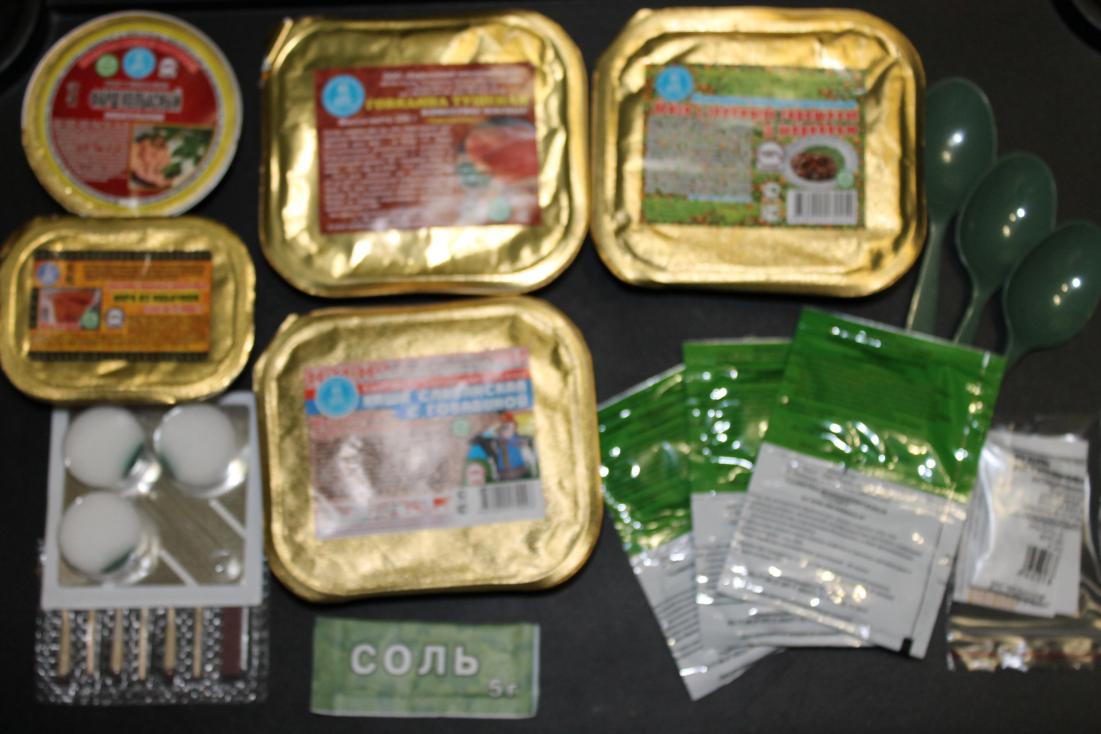 В большинстве ИРП есть мясные, мясо-овощные и овощные консервы, каши, сыры, сало, рыба, повидло и фруктовые пюре, галеты из черного и белого хлеба. А также НАТУРАЛЬНЫЕ тонизирующие напитки. В случае если нет питьевой воды, в сухих пайках есть средства обеззараживания воды, витамины. В некоторых есть шоколадка или шоколадная паста и жевательные резинки. Для разогрева продуктов, в комплекте сухпайка идет портативный разогреватель, а для разведения огня - спички спецназ, которые горят даже под водой. Всегда в комплекте также ложки, влажные и сухие салфетки, приправы и многое другое.