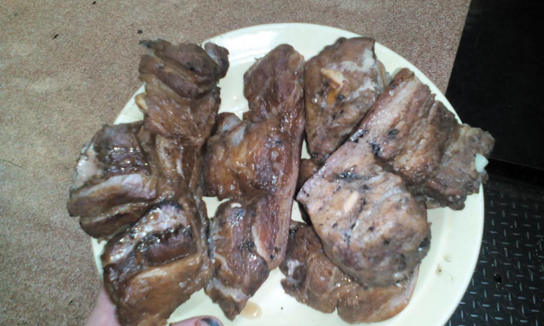 Жена опять задерживается на работе,птенчики рты открывают,кушать просят.С утра достал из морозилки ребрышки косулячьи.Рецепт очень простой,вполне справится любой даже очень далекий от кухни человек(самое сложное - отнять у косули ребра).В гусятницу наливаю немного масла без запаха.Козлик осенний и у него своего жирка натопится. На большом огне обжариваю,постоянно помешивая ребрышки мин 10-15.Определяю на глаз,когда перестает кровь выступать.Затем заливаю на 1.5-2 кг ребер 100гр соевого соуса,300гр домашнего кетчупа,с десяток душистого перца горошком,с пяток лаврового листа,немного соли(не забываем,что соевый соус очень соленый) и заливаю кипятком так,чтобы покрыло все кусочки.Перемешал и на медленный огонь под крышку тушиться.В процессе несколько раз открываю и перемешиваю.Готовность определяется,когда мясо начинает отставать от костей.В среднем по опыту 1.5 часа.А пока этот процесс идет отварил макароны,на сковородке с маленьким содержанием масла обжарил грибы(в моем случае это были лисички) смешал и мин 5 на медленном огне подержал под крышкой.Порезал свежую зелень.Есть пару фотографий,фото с красиво все разложенным сделать не успел,отвлек звонок и дети уже картину маслом слегка "попробовали".Всем приятного аппетита!