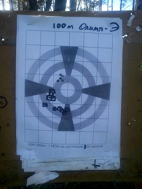 Группа - 5 выстрелов, бегу отмечаю, делаю поправку просто визуально, поднимая ТП (точку прицеливания). Винтовка пристреляна на сотню патроном "Охотник - 410Э", а "Олимп" - дозвуковой, следовательно летит на сотню ниже и, как оказалось чуть левее - (с моего ствола).