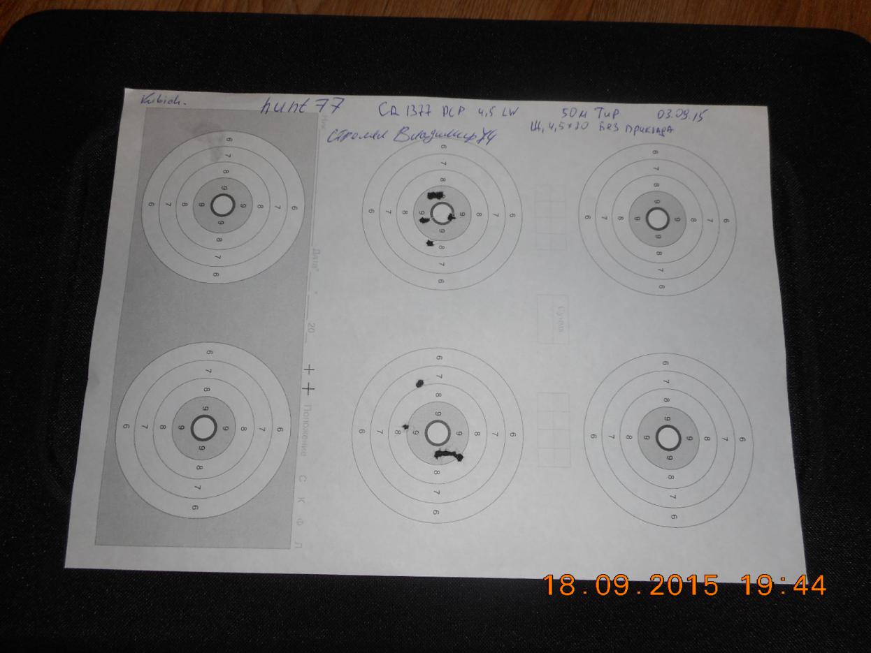 Кучность на 50м на фото. Без приклада и с прицелом Щ4.5.