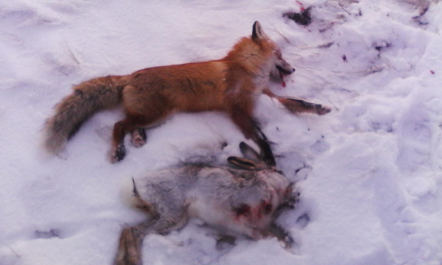 Проехал 3 км следов море где же мой пробежал!? Еду вдоль полосы сдвойка, кончались следы зайца кругом одни лисьи....Иду на боевой разворот вот скидка... Встал на лыжи иду вдоль полосы ...Встал заяц метров в 25-ти чешет в дебри лесополосы ясеня- вскинул машинально... выстрел, брызги снега -агония, дошел мой первый новогодний заяц вот он....
