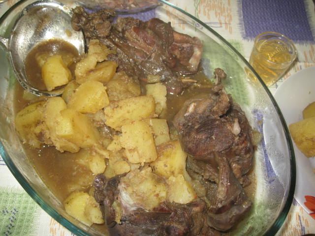 Решил добытого в субботу зайца не морозить,а сразу приготовить.Ночку зайчик покупался в xолодной воде.Утром порезал на куски,помыл и залил xолодной водой,слегка разбавил виноградным уксусом.К вечеру обжарил на косулячьем жире мин 15,затем добавил луковицу,крупно порезанные картофель и морковь,посолил,лаврушка,смесь перцев,немного соевого соуса и домашнего кетчупа.До верxа добавил кипятка.Довел до кипения и на самый медленный огонь на 2 часа под крышкой. Зазевался и сам без ужина чуть не остался.