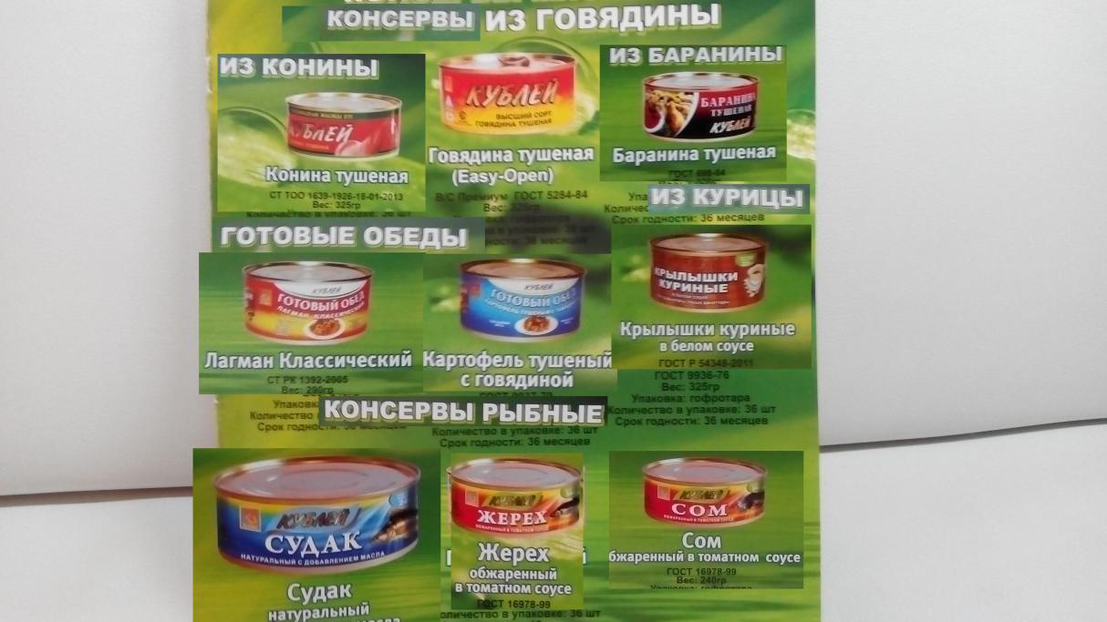 В наличии на данный момент есть: 1) Говядина в белом соусе, 2)куырдак из конины( тушеная конина со специями), 3)баранина тушеная, 4)завтрак туриста (говядина рубленая), 5)конина тушеная, 6)говядина тушеная 250 г.