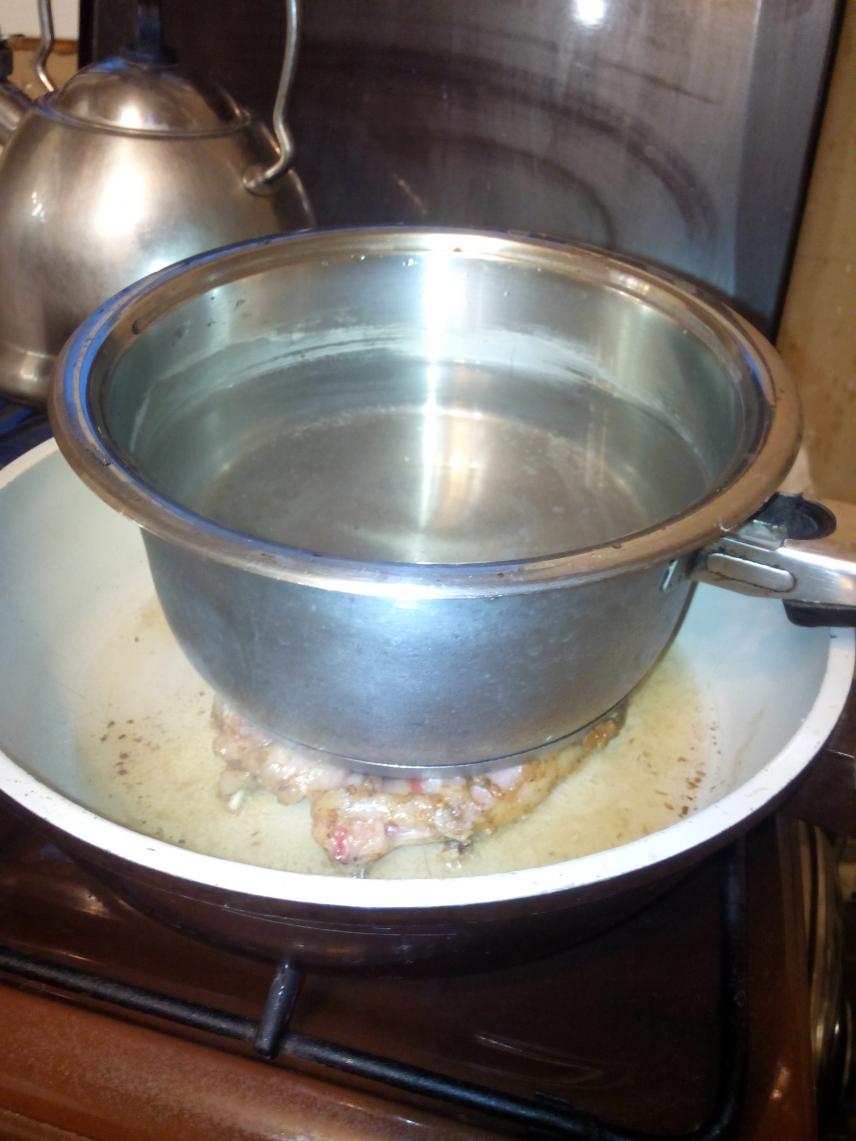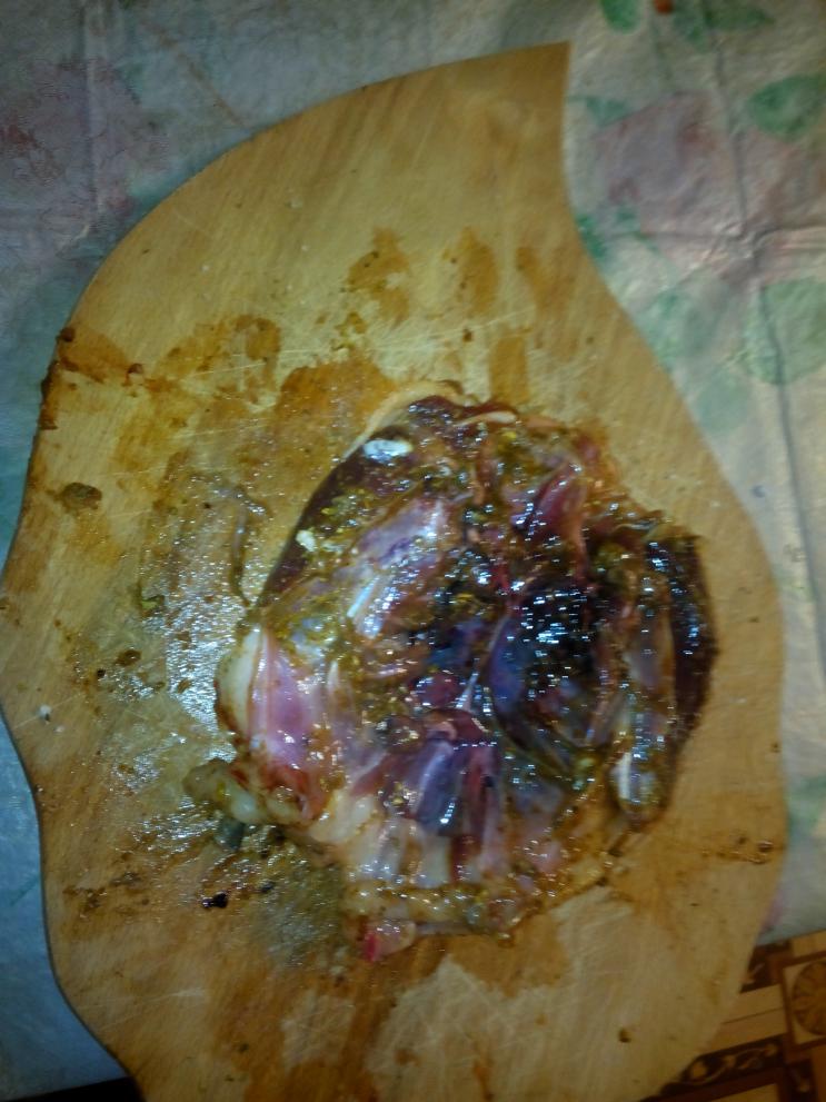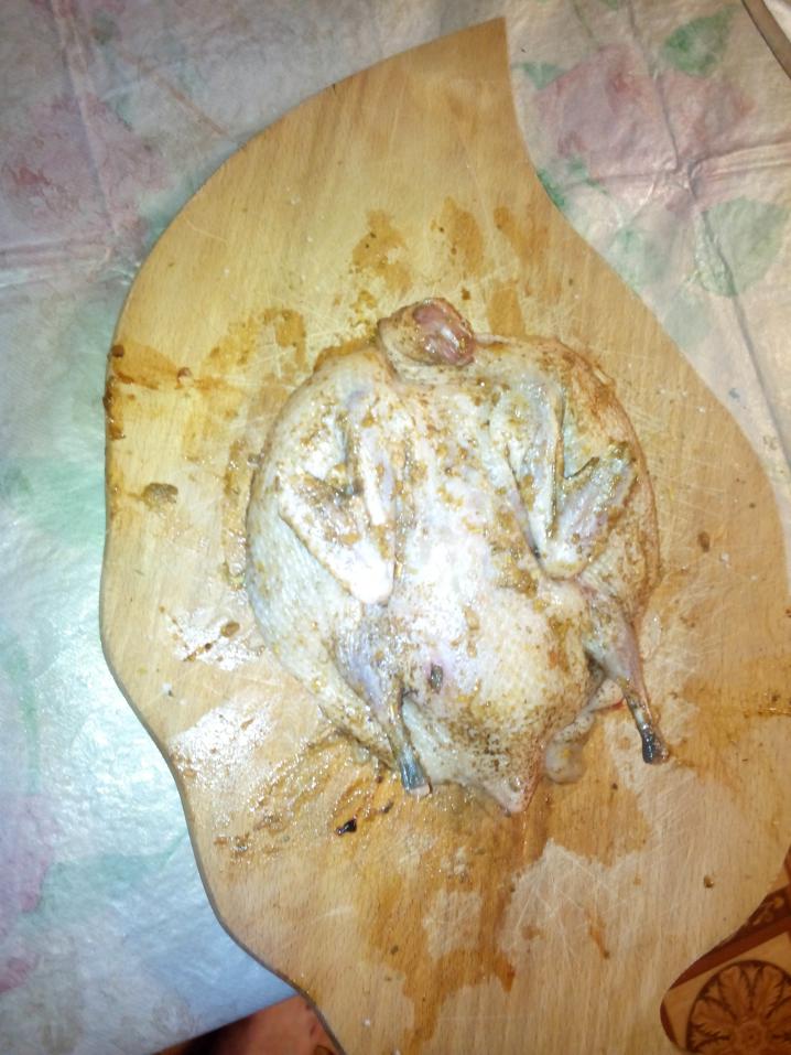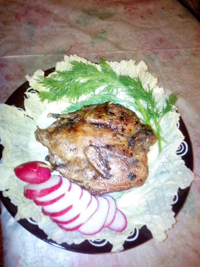 Чир был разрезан вдоль по грудке, натёрт солью, перцем, чесноком и зажарен под грузом как цыпленок табака. Короче получился чирок табака. |