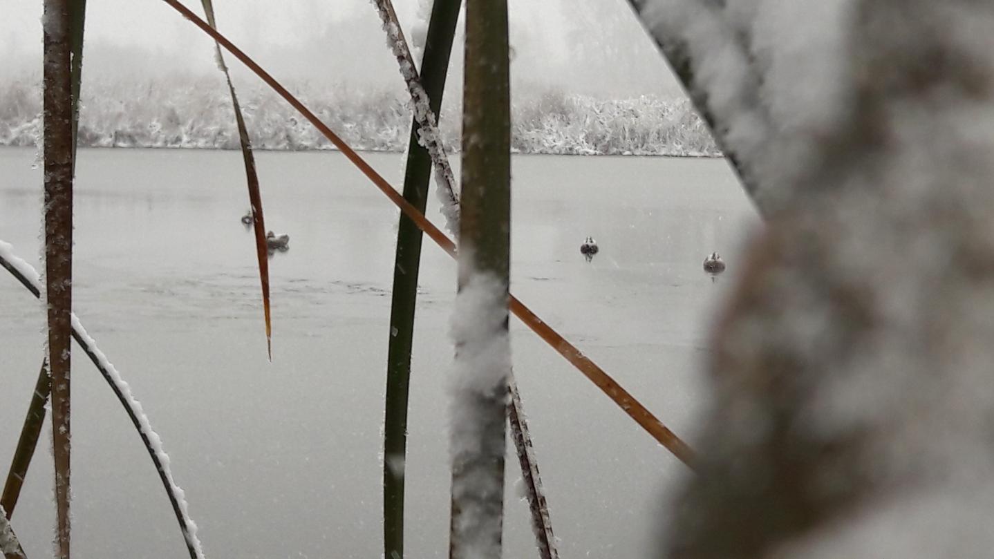 Снег валил, как на Новый год. Весь камыш был укрыт снегом как ковром, а под ним свободные ниши, как гроты. Выставил чучела 16штук (10девок и 6 селехов). Загнал лодку под ковер камыша носом, а с кормы установил, как ширму, на шестах маскировочную сеть. Маскировка была супер, особенно, когда на сетку и лодку лег густой снег. Но снег же и подвел - налипал на чучела, так что они были как снеговики.