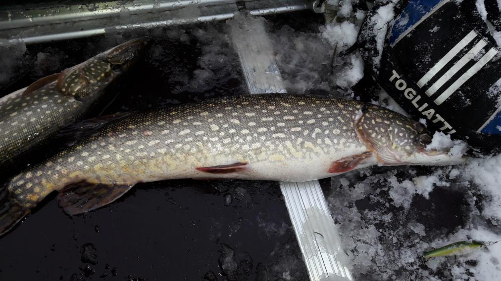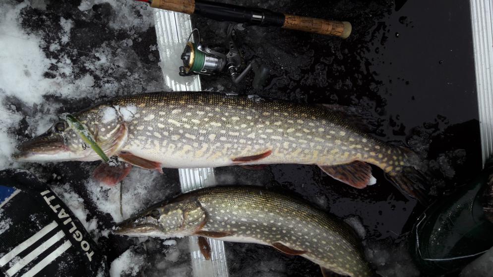 Сегодня был на Реке. Закрыл водно-моторный сезон и рыбалку по жидкой воде. Ждал большего... Но и так хорошо! Большенькая на 3.400, меньшая 1.700. Кольца обмерзали - полоскал в воде. А вот пропитать рабочую Ультегру 3000С забыл. В итоге плетня обмерзла и пошли сбросы кольцами. Хорошо вчера вечером перебрал и почистил женушкину Дайву Регал (а я ее три года назад пропитывал - катушку,т.е. плетню ) и взял про запас. Хоть и стопоры обратного хода все промывал от смазки в "Галоше", один хрен на морозце подклинивают и дают обратный ход раз на три. Все на Лаки Крафт Поинтер 100 суспендер. Паузы делал по 3-4 сек. На паузе слышу - ТЮК! Подсечка - мимо! И так не раз. В пригляд вижу - выходит за вобом, бьет носом и все! И только две прикусили его слегка и сделали мне день и закрытие сезона. За что им респект!