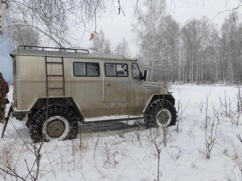 На крайней охоте передвигались по угодьям на вездеходе "Макар". На обычных шинах ( не низкого давления ) на двух мостах. См. фото. Из впечатлений - достойная проходимость и комфорт (водителя, обогревателей и проч. Хотя стекла подмерзают, для борьбы с чем приколхожено пару вентиляторов.) Проходимость по личным ощущениям немного выше уровня ГАЗ-66 при чуть лучшей маневренности. Если конкретно: снег до колена, сверху пухляк, ниже плотный с хорошей коркой наста посредине. УАЗ и проч. уверенно садится на первых 5-10 метрах. Макар движется уверенно, в том числе на задутых низинах, где снега поболее. На травссе понятно валкий, курсовая около 60-ти. Т.е. хорошая машина для "внутри угодий". Из недостатков: отсутствие грузового отсека. Посадочных мест с комфортом 8, в т.ч. водитель.
