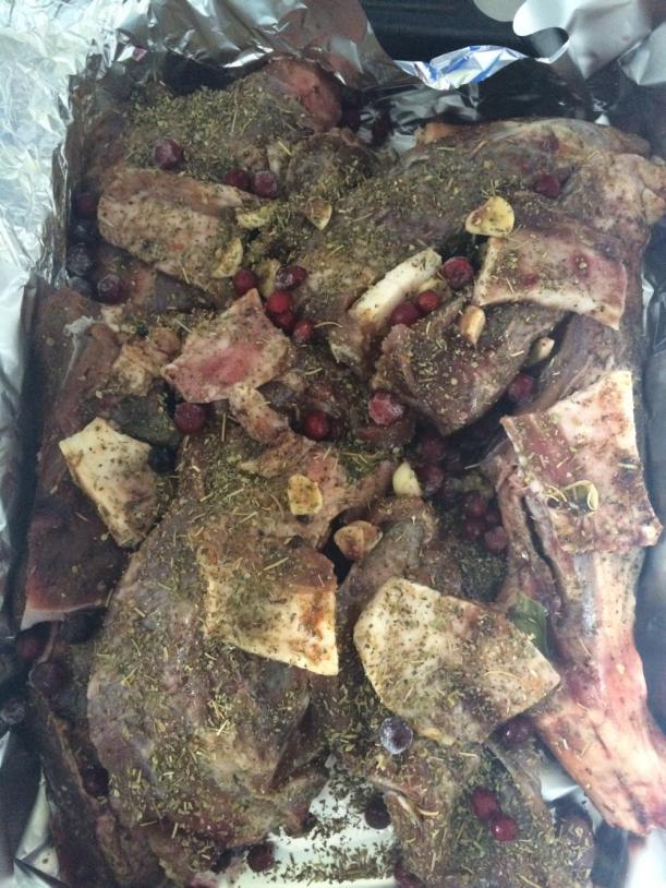 Всем привет. На свою днюху замутил такое блюдо: "Запеченные ноги сеголетка кабана и косули". Делал так: достал, разморозил... Натер солью, душистым перцем и прованскими травами... Через сутки выложил на противень сало свиное кусочками, сверху несколько кусочков, посыпал для кислинки брусникой и клюквой и добавил 50 грамм сухого вина Саперави... Далее сверху обмазал майонезом с чесноком, накрыл фольгой и в духовку на 2 часа при 170 градусах. Очень мягкое и нежное мясо (от кости отходит)... Всем приятного аппетита!