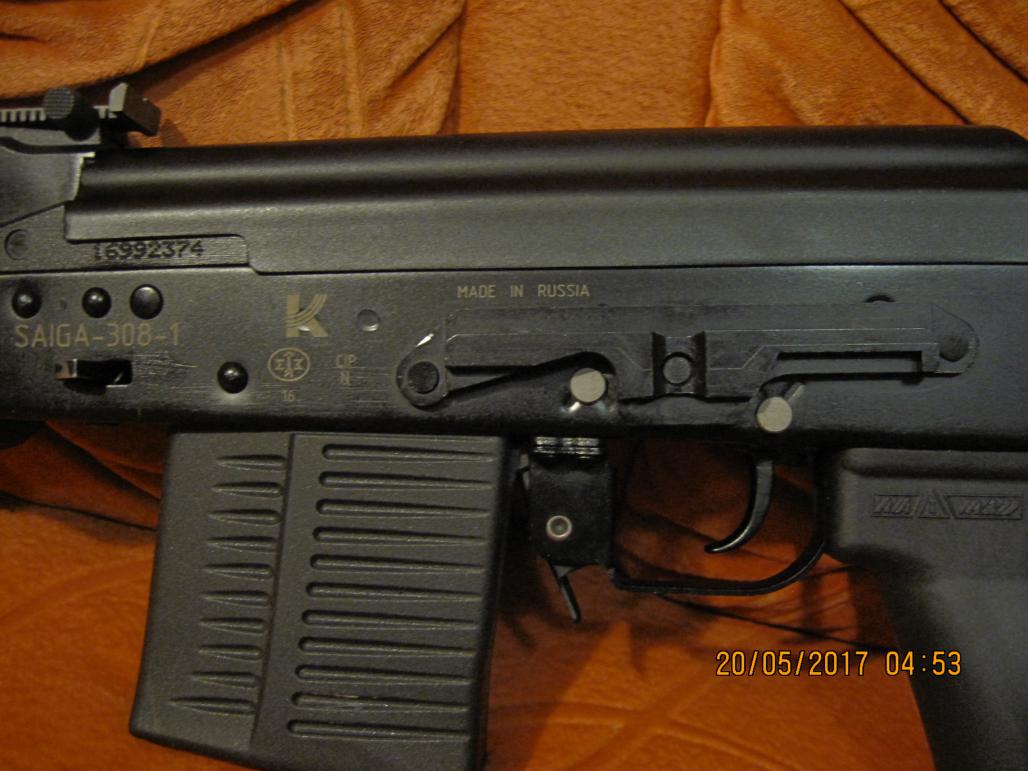 Продам Сайгу к.308 исп.50, отобранная по кучности, по паспорту 56 мм, куплена в январе 2017, настрел 32 шт. кентавром, съемная заводская гайка, резьба на 14 левая. Цена 25 т.р. без торга.