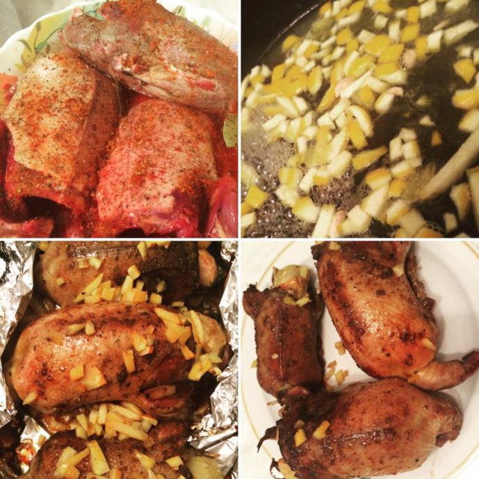 "Утка с яблоками под апельсиновым сиропом". Подготовленная тушка (очищенная, промытая, кожа сохранена при ощиповании)замаринована в соли и перце на 12 часов. Шпигуем салом без фанатизма, хоть утки очень тощие. Внутрь уток ложим сальцо кусочек и яблоки ( с дачи, красные, не было других))) Завернул тушки в фольгу и в духовку на 1,5 часа при 170 градусах. Пока тушка запекается, нарезаем шкуру 1 апельсина ломтиками, сок апельсина выдавливаем в сковороду и нарезанную шкурку туда же, добавляем туда же сахара две столовые ложки, кипятим пока не выпарится почти вся вода - получаем сиропчик. Достаем тушку из духовки, поливаем сиропом (его по объему остается как раз обмазать тушки), корки аккуратно раскладываем поверх на тушку. Ставим все в духовку на 15 минут открыто. 10 минут и все было съедено семейством, даже кто дичь не воспринимал... ))) Рецепт с Ганзы.