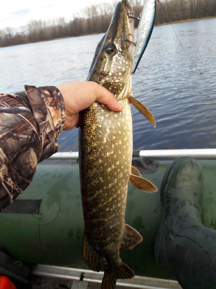 Ловил на Лаки Крафт Поинтер 125 суспендер (номинал), но по факту медленно тонущий. Проводка вялотекущая, засыпающая, с паузами по верхнему свалу. Снасть мультипликаторная. Несмотря на наличие подсака, всю щуку принял руками. Сходов не было.