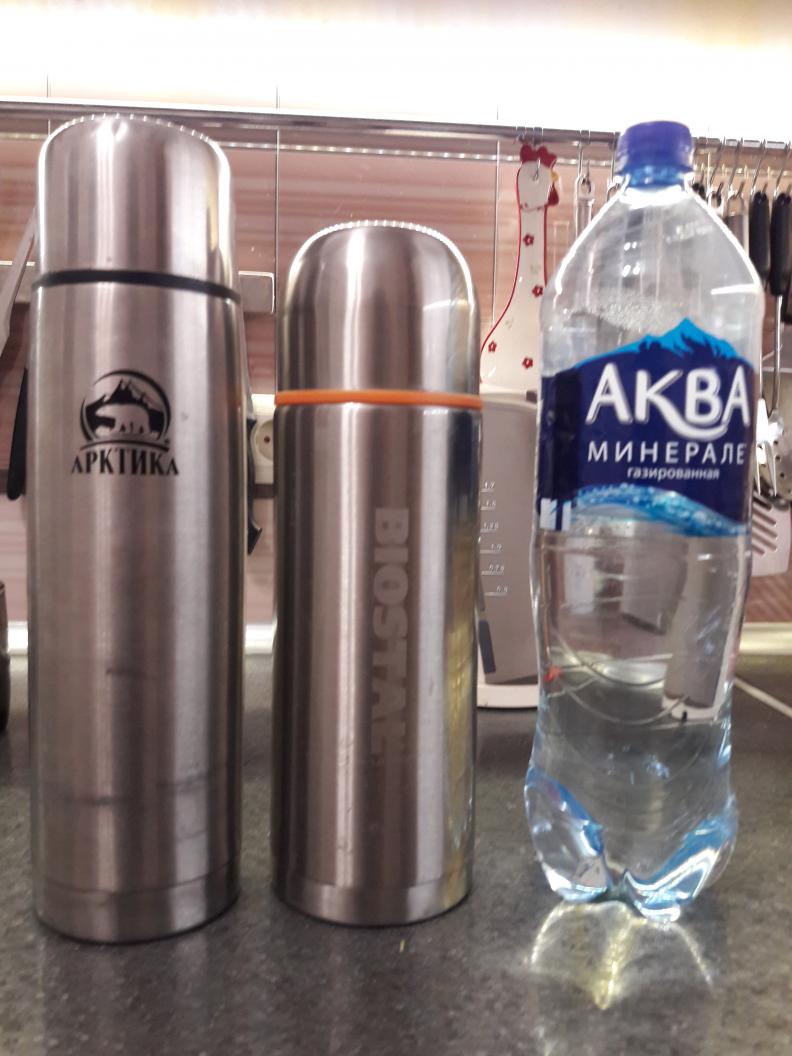 Ну, вот сегодня полевой тест. Участники Босталь 1л и Арктика 1л. Аква Минерале 1,5л для сравнения. Оба термоса подарили мне дети Тимоха с Варюхой на день рождения 2 года назад. Заполнены чаем были в 5:30. Примерно в 8:30 стал на лыжи, температура в это время -26. Один термос (Биосталь) с собой, второй (Арктика) оставил в машине. После 10:00 потеплело до -20. Делал один привал минут на 15 примерно около 12:00, чай обжигал, приходилось остужать. К машине вернулся около 14:00, разшнуровался, собрался , прогрелся, сел попить чаю с бутером - чай обжигал. В ТЛТ прибыл в 15:50. Забрал чай и бутеры с собой на работу и допил остатки -чай был горячий! Второй термос Арктика оставался снова в холодной машине до 18:30. Занес домой,ь оставил. В 22:30 вернулся от друзей, налил крышечку -горячий! Выпить залпом на грани амбулатории!