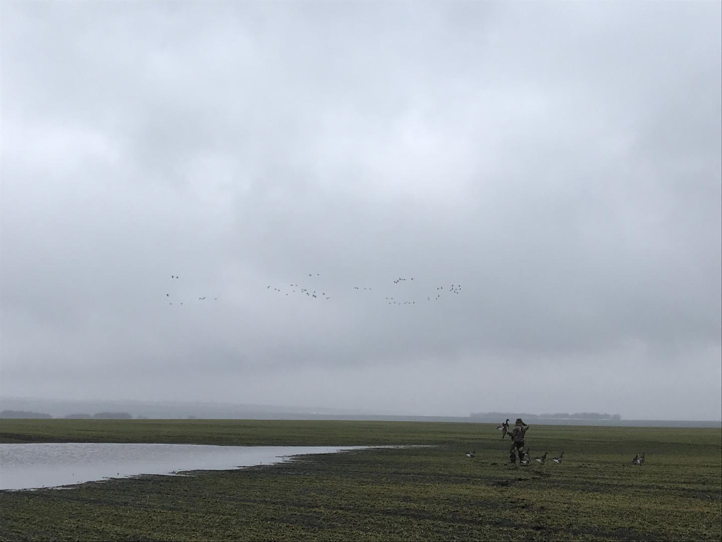 Одна охота с упором на гуся, хоть его и не было особо. Следы пребывания есть, а гусей нет, по всей видимости пропер ночью. Охотились в поле на лужах.