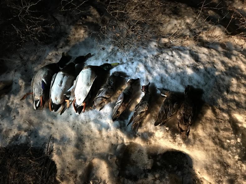 Среди трофеев, кряки, свиязи, красноголовые нырки, свистунки, трескунки и селезень серой утки