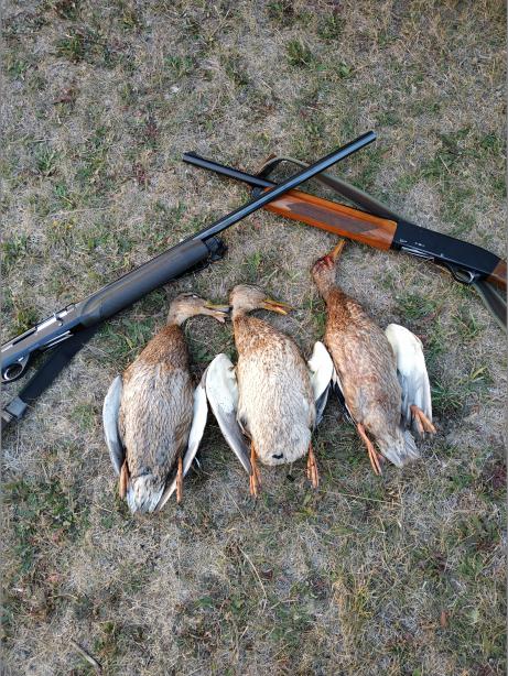 Результат сегодняшней утрянки. Всё больше убеждаюсь что чирок это самая бронированная птица. 4 раза его осыпал пятёркой с 30-35 метров, что бы он перестал плыть к спасительным камышам. Только попадание в голову его успокоило. Зато жирный , аж жир течёт пока опаливаешь.Чуть не забыл - видел двух гусей летящих на высоте метров 100. Если бы сам не видел не поверил бы. Рановато как то ещё.