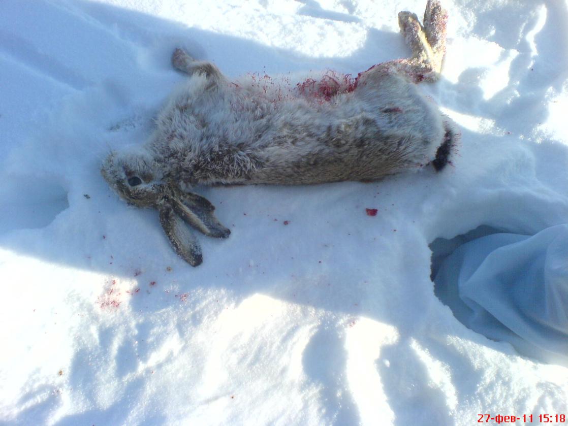 Сегодня закрыли сезон в Домашкинском ох.х. со счётом один заяц на четверых за сезон. Заяц получился трудовой, подняли и стреляли около машины, а потом 15 км торопили подранка. Заяц оказался уже стреляный, уши как решито, но это видимо еше по осени, раны уже зажили.