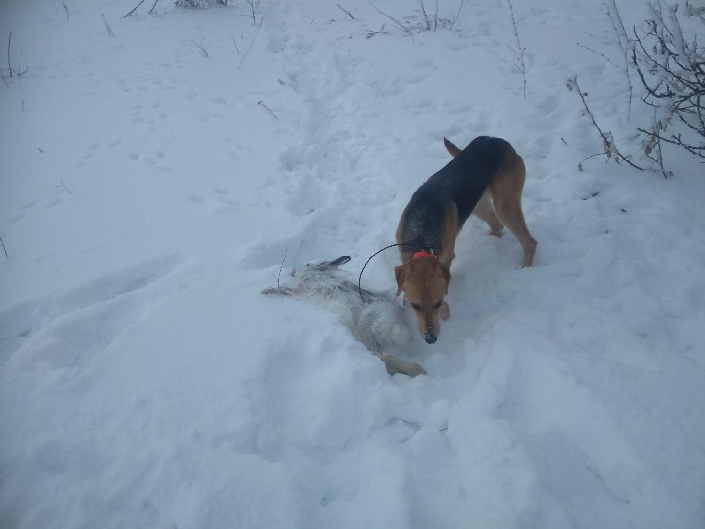 Сделали очередной выезд на зайца.Следов полно попытались по тропить.Пустой номер ни одного не подняли.Хорошо собачка была с нами.В итоге два подъёма.Один с нами второй на племя.Охота была трудовая без лыж просто опа.В конце выжловочку почти нес на руках.Корка поранила все лапы.Молодая но радует своими работами.