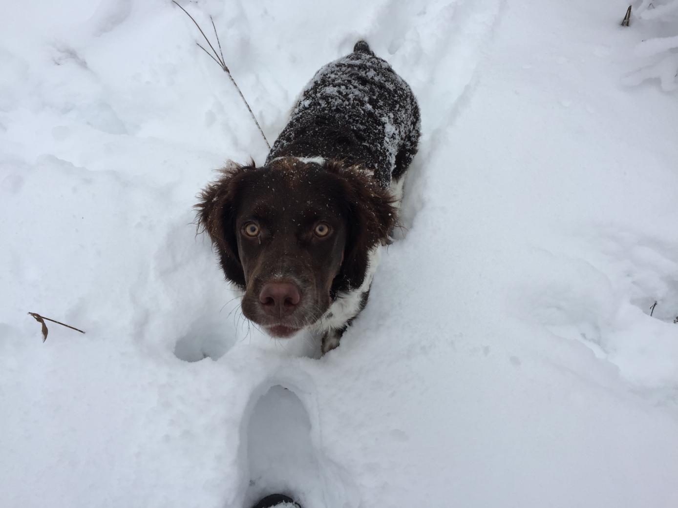 Сугробы - это наше все! Мышкует непрерывно, энергия щенячья неиссекаемая. Освоили две команды по свистку : ко мне и смена направления.