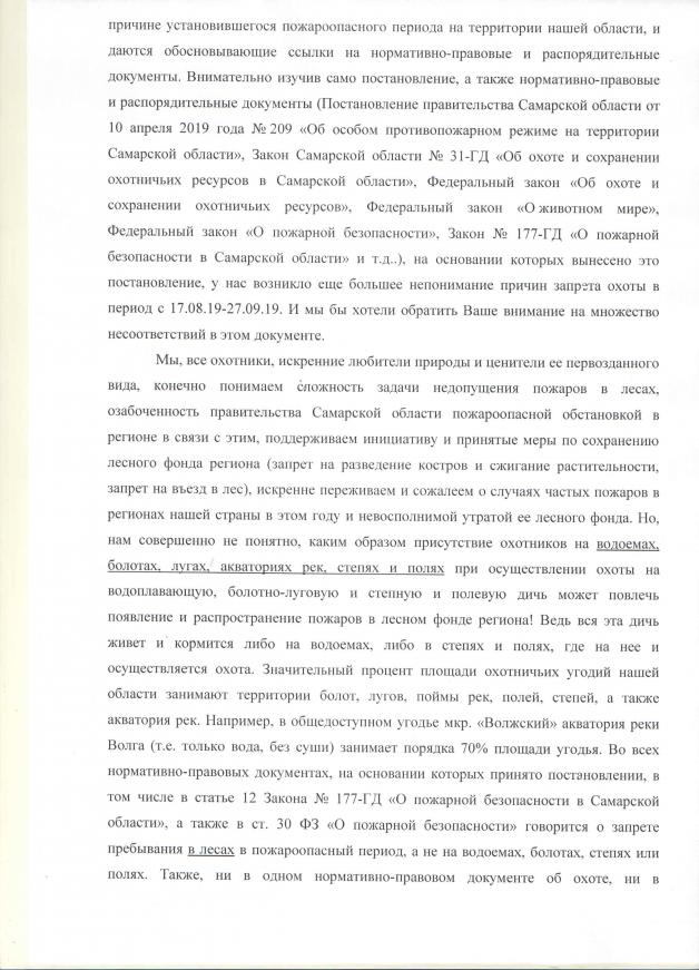 Нижеподписавшийся коллектив охотников Самарской области (в дальнейшем - охотники), просит принять меры по отмене постановления Правительства Самарской области № 516 от 19.07.2019г. «Об установлении запрета на проведение любительской и спортивной охоты в отношении отдельных видов охотничьих ресурсов и способов охоты на территории охотничьих угодий Самарской области» (в дальнейшем – запрет на охоту)