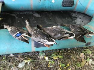 Сегодняшняя утряночка)) Вышли вдвоём на любимое кормовое болотце пораньше, сидим, крякаем, ждём. Зенитчики, как обычно, поливают свинцом небо, по шелесту крыльев над головой понимаем, что лёт хороший, но к нам, почему-то не спускаются, как мы не заливались песнями на манках)) Уже на рассвете, когда мы почти отчаялись, шелест крыльев и вот они, опускаются, родимые! Четыре кряквы шумно приземляются, чтобы полакомиться ряской. Два выстрела по крайним уткам оставляют их лежать на месте. Два селеха поднимаются в воздух, но ещё один дуплет прерывает их взлёт! Два дуплета, просто праздник какой-то для нас в награду за терпение и труд! Ну и затем, топаем за лодкой и забираем четырёх друзей с собой.