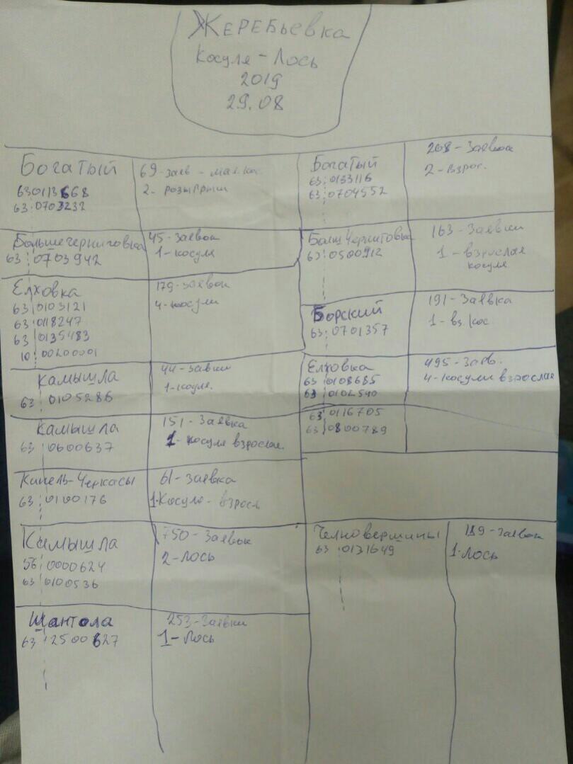 Косуля сибирская № п/п Регистрационный номер заявки Серия, номер охотничьего билета Возраст ОдОУ муниципального района Елховский 1 844 63 № 0108685 взрослая 2 256 63 № 0102540 взрослая 3 180 63 № 0116705 взрослая 4 804 63 № 0800789 взрослая 5 1471 63 № 0103721 до года 6 895 63 № 0118247 до года 7 616 63 № 0135483 до года 8 843 10 № 00200001 до года ОдОУ муниципального района Богатовский 1 276 63 № 0133116 взрослая 2 205 63 № 0704552 взрослая 3 9 63 № 0113668 до года 4 915 63 № 0703232 до года ОдОУ муниципального района Борский 1 1121 63№ 0701357 взрослая ОдОУ муниципального района Большечерниговский 1 1286 63 № 0500912 взрослая 2 880 63№ 0703942 до года 1 1197 63 № 0600637 взрослая 2 1460 63 № 0105286 до года ОдОУ муниципального района Кинель-Черкасский 1 248 63 № 0100176 взрослая Лось ОдОУ муниципального района Камышлинский 1 296 63 № 0100536 взрослый 2 696 56№ 0000624 взрослый ОдОУ муниципального района Шенталинский 1 563 63 № 2500627 взрослый ОдОУ муниципального района Челно-Вершинский 1 1075 63 № 0131649 взрослый |