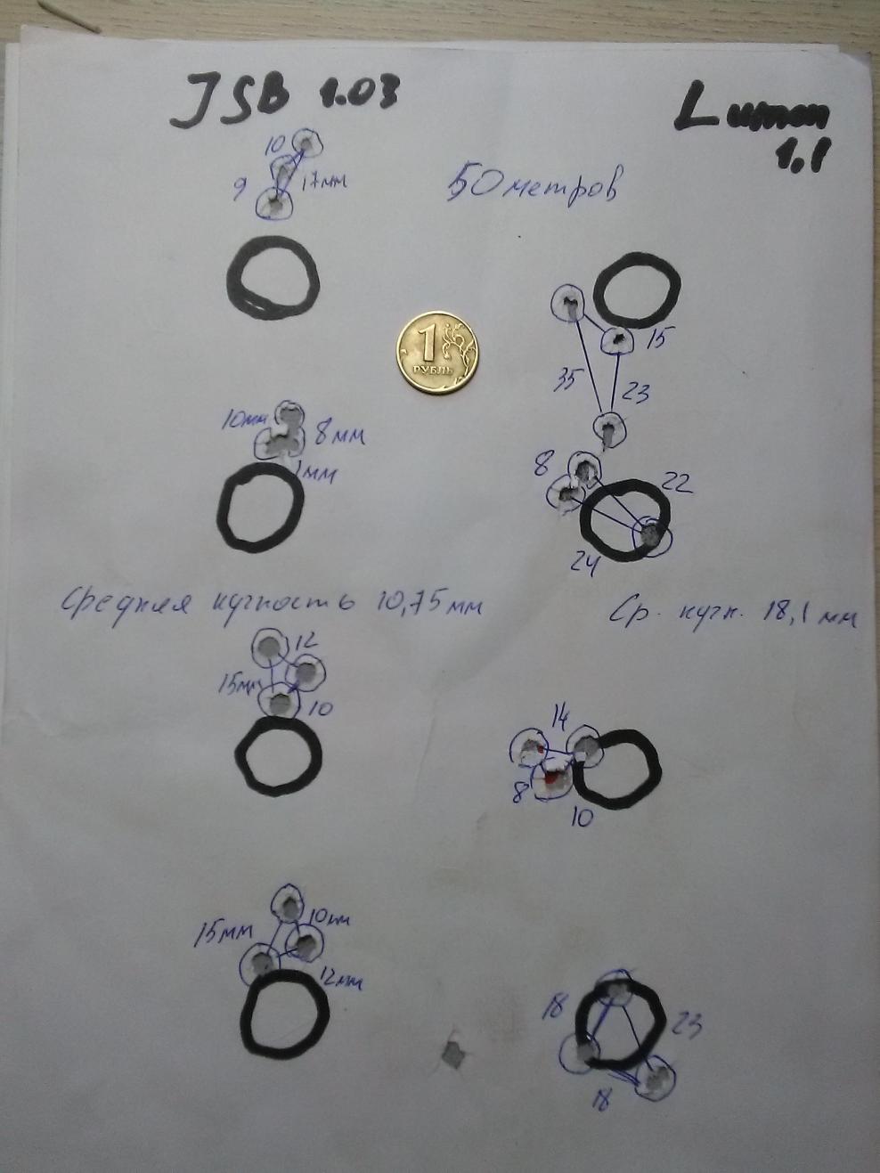Сделал отстрел на 50метров. JSB 1,03 гр средняя кучность 10,75мм по центрам. Люман 1,1 гр средняя кучность 18,1мм по центрам. Две банки пуль Люман 1,1 гр в подарок!