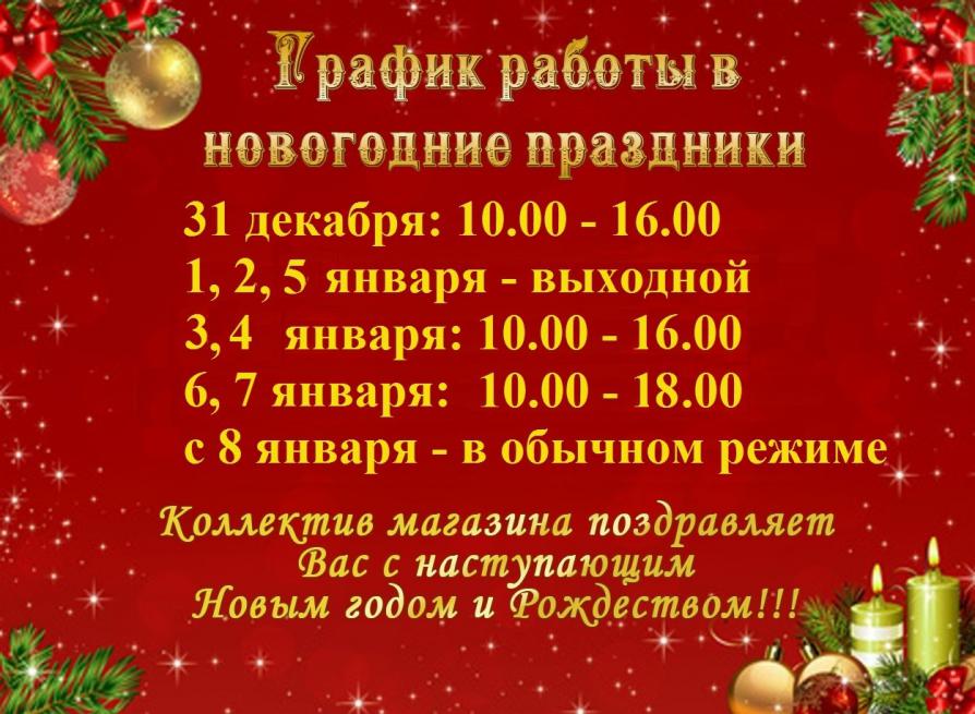 31 декабря: 10.00 - 16.00 1,2,5 января: выходной 3,4 января: 10.00 - 16.00 6,7 января: 10.00 - 18.00 с 8 января магазин работает в обычном режиме |