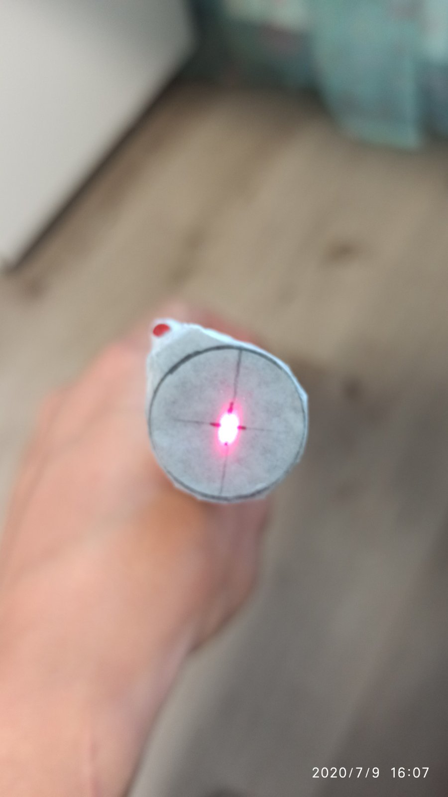1. Берем лист бумаги (я взял пищевую пленку), чертим круг по диаметру дульного среза. Выставляем центр. 2. Прикладываем (я закрепил на резинку для косичек. Прям как для этого и создавались)). 3. Далее смотрим, как показывает приобретенный ПХП. Крутим по кругу и надеемся, что в каком-то положении лазер совпадет с центром. У меня этого не случилось. 4. Манипуляции с малярной лентой и ПХП. У меня ушло 5 минут. 5. Как нашли нужное положение, делаем метку на ПХП и запоминаем метку на стволе для дальнейшего совмещения. 6. Пристреливаем калик не снимая с затворной задержки, да бы не сдвинуть лазер. |