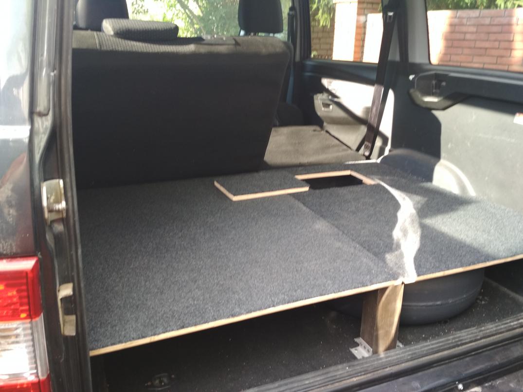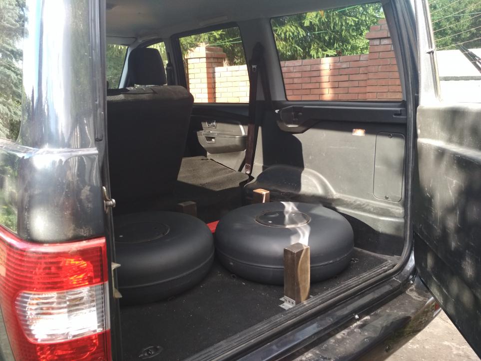 Проект не закончен, но в общих чертах понятно. Принимайте. Теперь свободно можно укладывать лодку, мотор, шмурдяк - да и просто поспать можно, откинув спинку заднего дивана в плоскость багажника. Между баллонами можно разместить кое-какой шмурдяк. Компрессор, например, кейс с инструментом. Огнетушитель в быстром доступе. А еще уже вытаскивал фанерный щит и использовал его в качестве столешницы на пикнике.