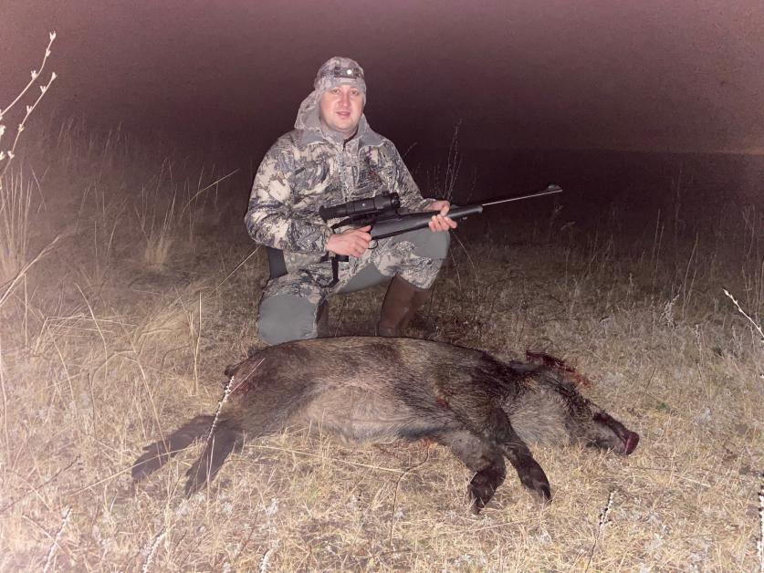 Первый снег 2020г. «Лех, снег… поехали», Ваня был не приклонен. Непогода – надо ехать в угодья! Приехали после работы, уже темно. Едем смотрим косули бегают, на окраинах все, красиво. Первую вышку проехали, вторую… Как то все внезапно, как обычно с кабанами… Смотрим идут. Свинья, три няньки (покрупнее) и сеголетки разных размеров, голов 8. Спокойно по травке шарахаются. Мы опешили, только курили сидели, болтали, ждали то попозже… Метров 170. Смотрим, целимся, идут слева направо. На чистое и для выстрела, примерно выйдут метрах в 130. «Твой третий, мой 4, только сеголетков». ОК. Вдруг свинья начала «пылесосить» воздух - многие слышали этот звук, когда свинья, мать, задирает морду к верху и вращая ей в стороны нюхает территорию, для определения инородных существ, типа человек… которые являются реальной опасностью для ее потомства. Планы стрельнуть на первоначальном месте естественно провалились, надо стрелять сейчас, на чуть дальней дистанции и немного в траве. Запомнил какой твой и в момент «на три - раз, два, три» стреляешь. Чего казалось бы проще… Все так, но когда охотника 2 и они находятся рядом, тяжело считать идущего зверя, кто то видит левого, кто то вдалеке другого… В этот раз было именно так. Оба выстрела громыхнули почти одновременно и было слышно два шлепка – прям как будто в ладоши кто то вдалеке хлопнул. Кабаны бросились за матерью и няньками и через 10 секунд их уже не было видно… Лежит кабан! А где второй, ну тот, что был 3-м или 4-м? Промах чей то. Наверное промах. Но шлепков было два, оба слышали. Спустились, подошли, лежит кабаненок, сеголеток жирненький. Два четких отверстия и из них пар остывающего зверя… А вокруг идет снег, легкий морозец, воздух свежий-свежий… Красота! С полем, Ваня, С полем, Леша! Посмеялись друг над другом и на базу…