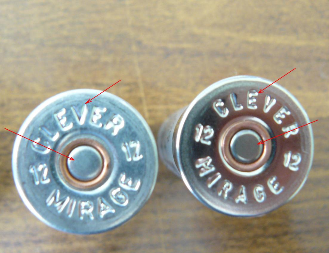 г) на донце гильзы надпись "KLEVER MIRAGE" выбита с разным оттиском и величиной шрифта. Фото справа (качественный патрон) четкое теснение букв, фото слева (менее качественный патрон) шрифт чуть больше и теснее менее явное, применен различный капсюл,