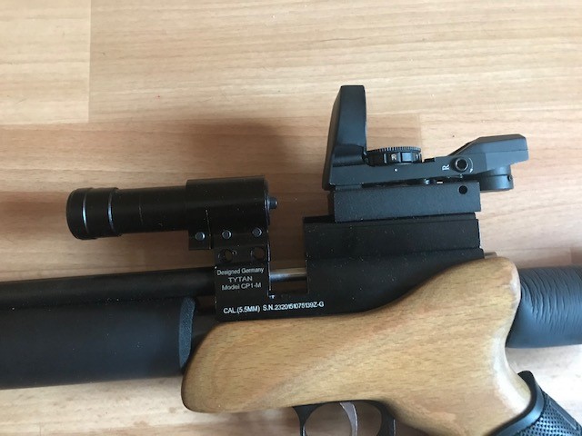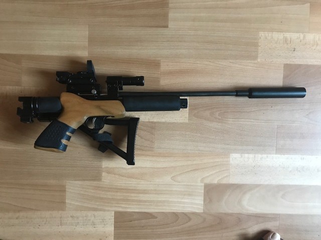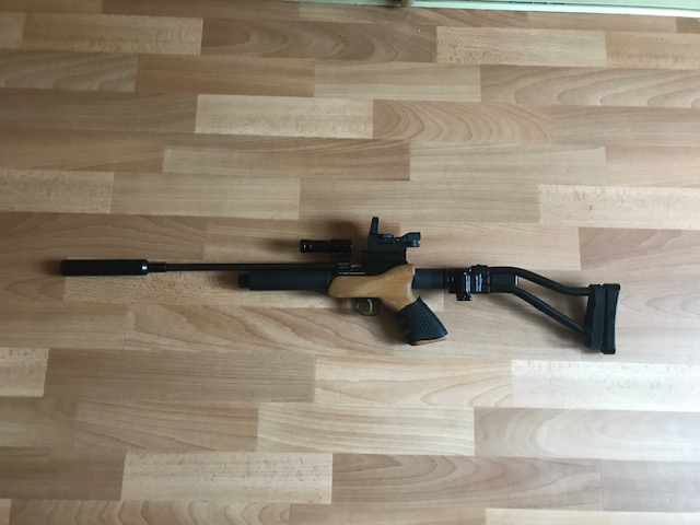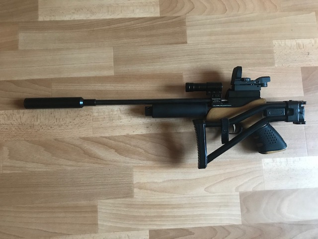 Продам пистолет Titan CP1 (он же Kandar, Strike One) кал. 5,5.. Заменен ствол на 300 мм, съемный складной приклад, съемный саундмодератор, коллиматорный прицел и лазерный целеуказатель. Работает на СО2. При необходимости легко переделывается в РСР с помощью китов. Скорость не мерял. Стреляет отлично.