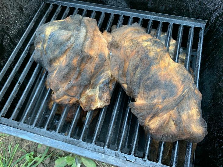 Гуся порезал пополам, селезни целиком – уложил в казан, приправил перцем, кориандром, лаврушкой, паприкой и обильно посолил (это очень важно, так в идеале мариновать в рассоле, что б мясо просолилось). Далее доводи до кипения и варим 20 минут, далее секрет – остывать оставляем в этом рассоле до полного остывания. Ну, а дальше все просто – опилки замочить на часок, на дно коптилки их, решетки ставим и каждый кусок гуся и целых селезней обворачиваем марлей в два слоя. Коптим на медленном огне 40 минут. Мясо получается нежным, сочным и очень вкусным. Дети и жена уплетали за обе щеки…))